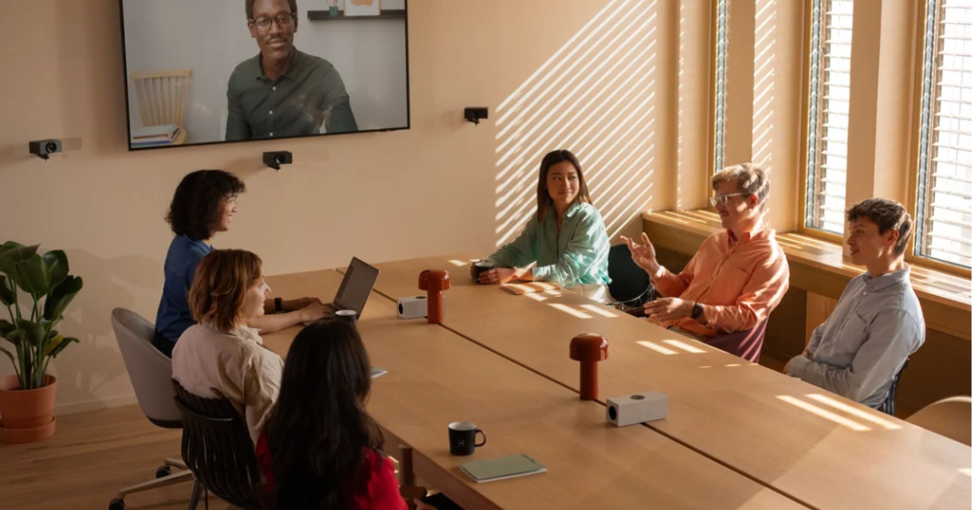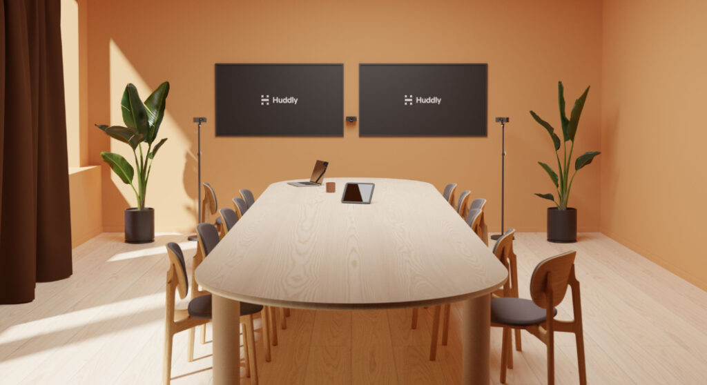 Für größere Konferenzräume und Boardrooms fungiert Huddly Crew als skalierbare Multikamera-Lösung. Dabei werden mehrere Huddly L1 Kameras miteinander verbunden und als ein intelligentes System betrieben. Die automatisierte Steuerung erfolgt mittels KI und sorgt dafür, dass alle Personen im Raum klar sichtbar sind, unabhängig von Sitzposition oder Raumgröße. In Google Meet passen sich die Kameraansichten dem Gesprächsverlauf an und ermöglichen Remote-Teilnehmenden eine bessere Wahrnehmung von Interaktionen und Sprecherwechseln im Raum.