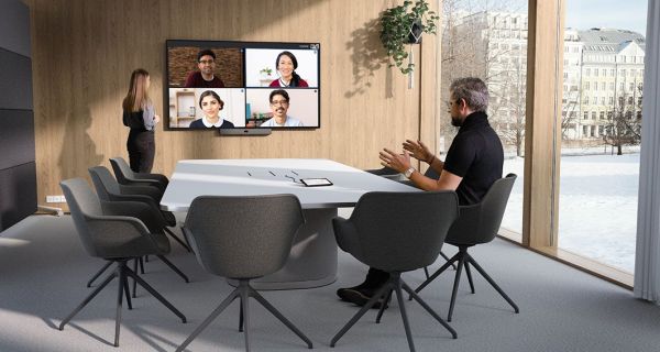 Moderne Audio-/Videobars für hybride Meetings. Das Neat Center erweitert die Möglichkeiten um ein echtes 360°-Sichtfeld, wahlweise auf dem Tisch oder abgehängt von der Decke.