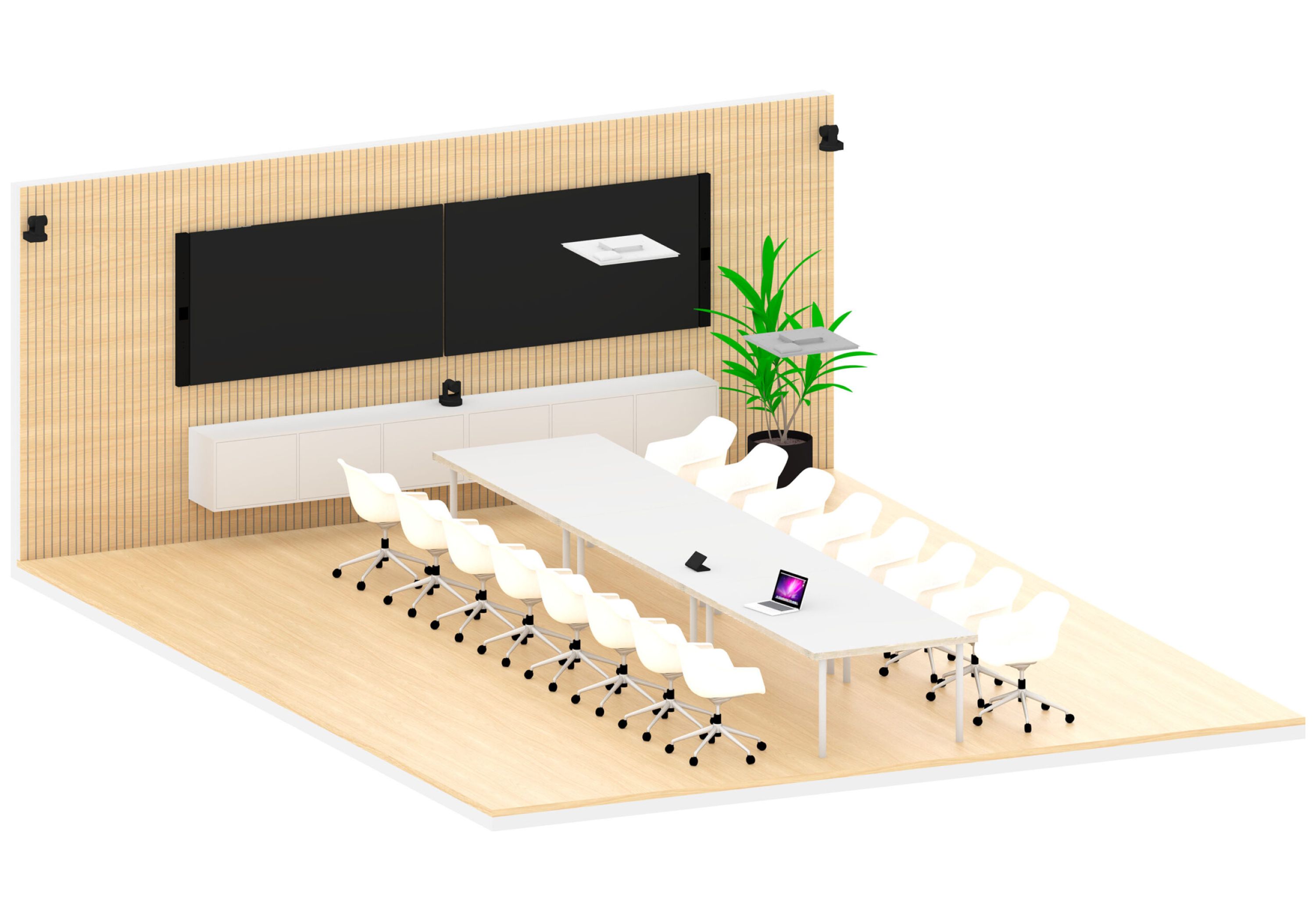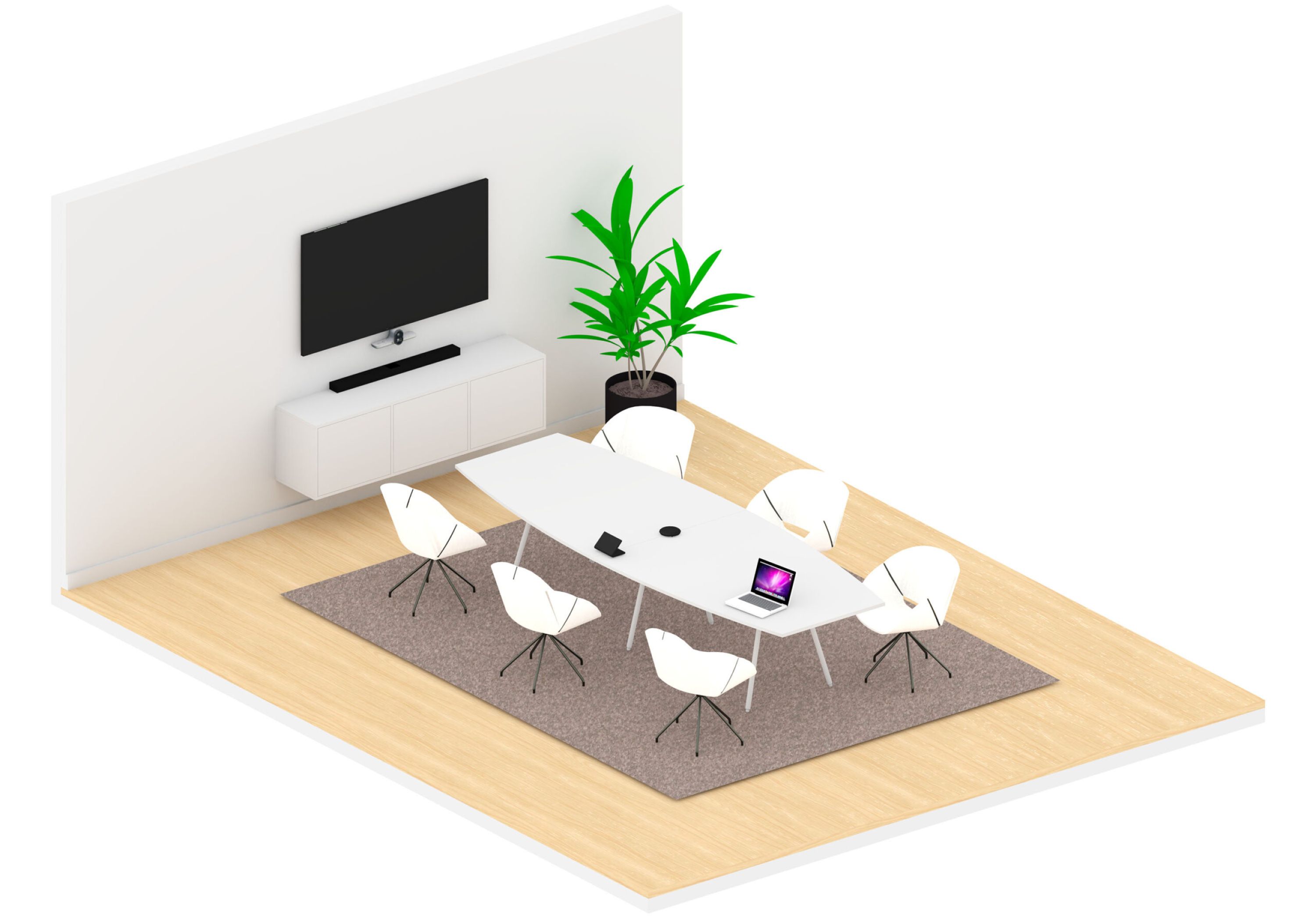 Ein Creative Room ist ein mittelgroßer Meetingraum, wie er in den meisten Unternehmen vorkommt. Hier findet das Daily Business statt: Hybride Meetings, Workshops, aber auch interne Meetings ohne zugeschaltete Teilnehmer.